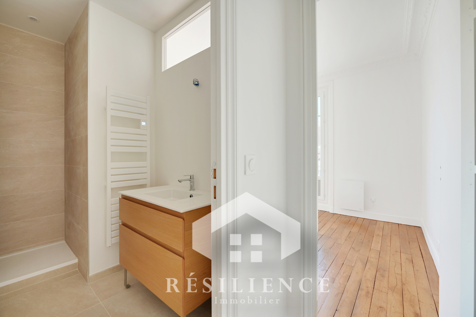 Doté d’un parquet, de moulures et d’une belle hauteur sous plafond de 2,80 m, cet appartement associe le charme de l’ancien à une rénovation contemporaine réalisée avec des matériaux haut de gamme.