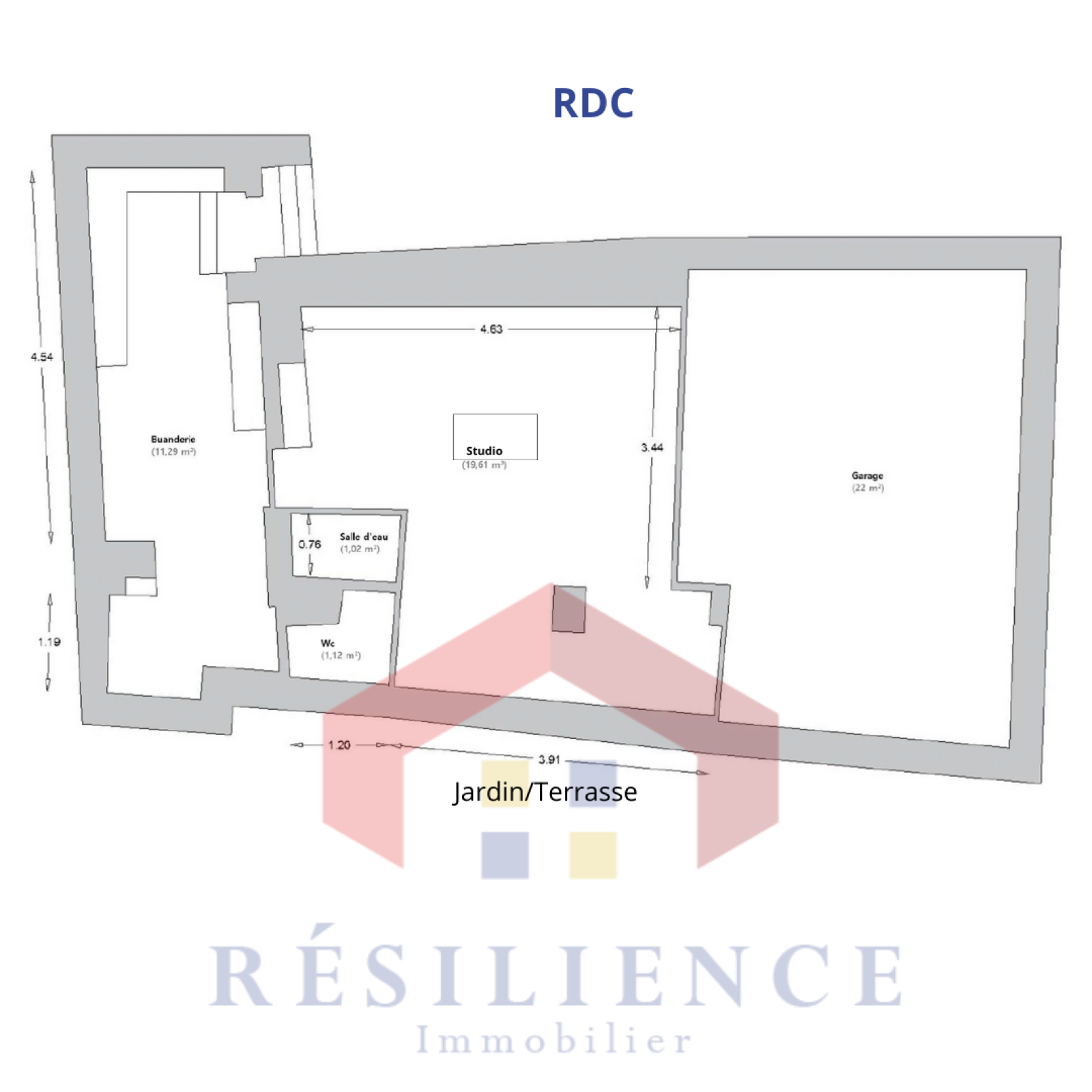 Rez-de-chaussée : un garage de 22 m², une buanderie et un studio indépendant de 20 m² entièrement rénové, comprenant cuisine équipée, salle d’eau et WC, avec accès direct au jardin végétalisé de 90 m².